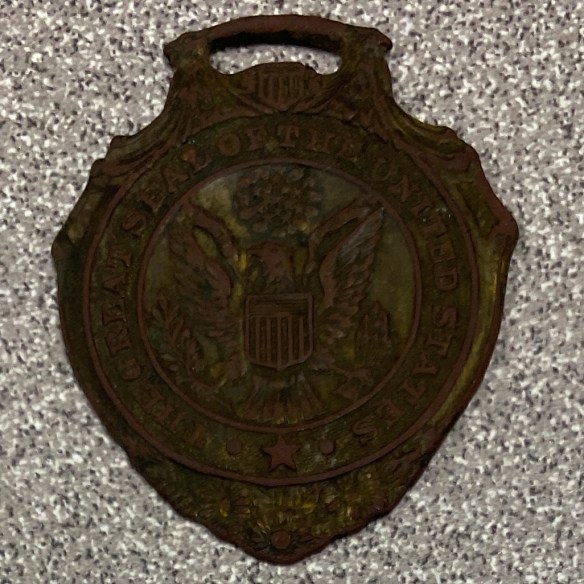 David E. recovered a pocket watch fob, featuring the Great Seal of the USA and dating from 1910, from a depth of 6 inches using his Deus XP II.