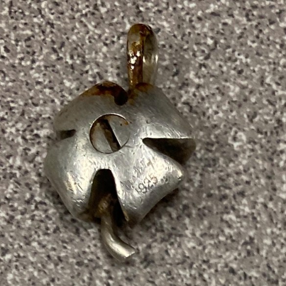 John Q. recovered a sterling silver, 4-leaf clover pendant for a loved one’s ashes at a depth of 3 inches with his XP Deus.